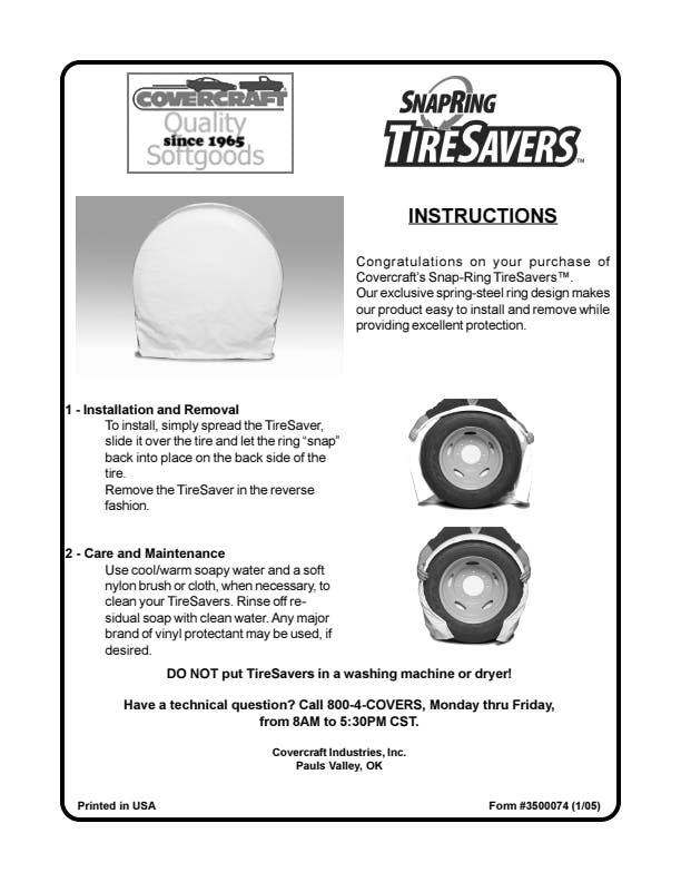 TireSavers make protecting your tires a "snap". Our exclusive spring-steel ring design holds the TireSavers in place and eliminates the hassle of crawling around on the ground to secure straps, bungee cords and/or other hardware.