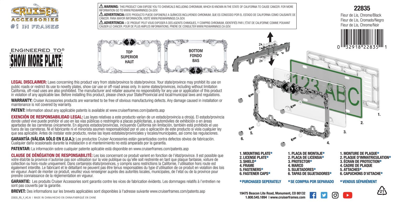 A chrome frame featuring a Fleur De Lis design; The Fleur De Lis emblem is adjustable to your preference, at the top or bottom of the frame with small set screws for a secure fit; Emblem insert is durable black plastic with chrome plated durable plastic Fleur De Lis overlay; Frame base is chrome plated zinc Die cast metal; Designed to fit all novelty/license plates; Easy to install.