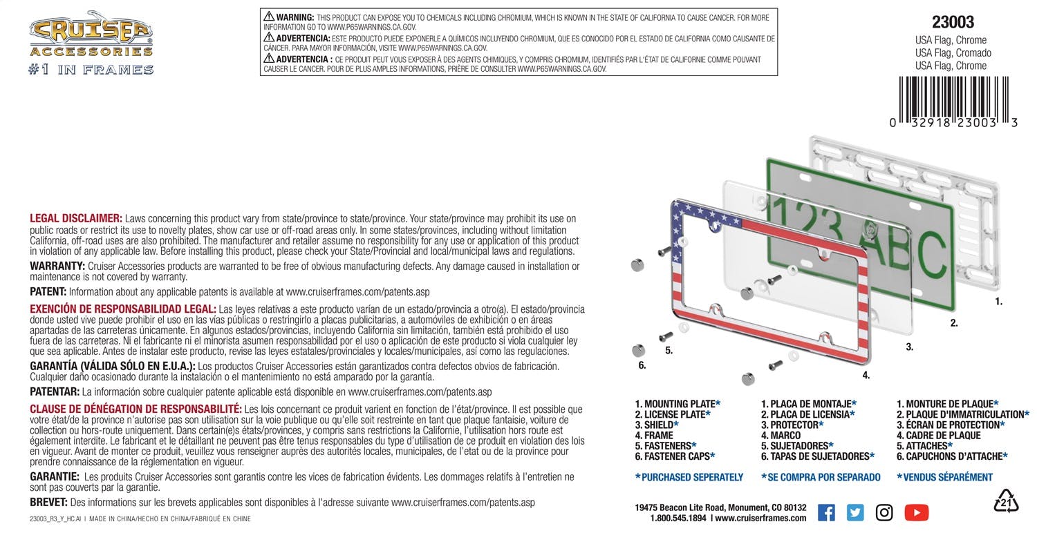 This USA Flag License Plate Frame (Chrome) adds style and class to any vehicle or license plate. It is also an Engineered To Show More Plate product, which means it displays more license plate surface area than a standard license plate frame. It features an American flag design, a clear polycarbonate insert that protects the graphics, chrome-plating, and UV-resistant ink. Installation is easy with step-by-step instructions included. Matching fastener caps, mounting plates, shields, and novelty plates are sold separately.