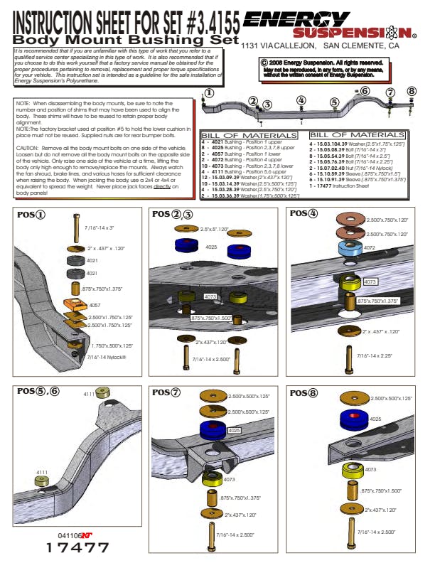Will replace distorted and worn-out original rubber mounts to maintain car body and truck cab to bed alignment. Original rubber mounts are so soft they often crack, distort, and crush so badly they often fall off! And aluminum body mounts are too harsh for street use that they tend to break and cause other components to break. Energy's specially formulated Hyper-Flex(TM) polyurethane cab and body mounts combine the best qualities of both: they're soft enough for a smooth ride, yet rugged enough for the most demanding road or track. Most sets have a strong zinc plated steel ring molded into them - for added durability and when the application requires it.