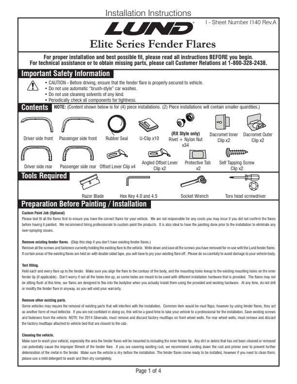 Lund Elite SX-Sport Style Fender Flares add style, protection and performance. Fender flares come in a variety of styles, from low-profile to big and bold featuring a textured or smooth paint-ready finish. The Elite Series Fender Flares are made with Tri-Flex ABS thermoplastic material to allow for maximum durability. This provides a dense, hard and scratch-resistant surface, flexible enough to bend without breaking.