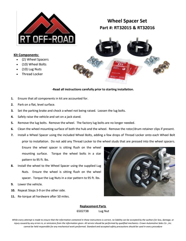 • Includes Spacers, Lug Bolts, Lug Nuts, and Thread Locker