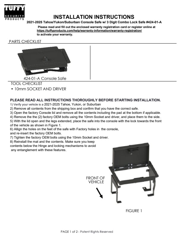 Upgrade your SUV with real security that doesn’t sacrifice factory convenience. The Tuffy center console safe for 2019–2025 Chevy Tahoe, Suburban, and GMC Yukon transforms the cavernous OEM console into lockable protection built to disappear in plain sight. Designed with vehicle-specific precision, it keeps the stock look intact—your factory armrest, tray, and console lid all function exactly as intended. Inside, you gain a fortress for valuables, electronics, and daily carry items, with heavy-duty steel construction, Pry-Guard(R) strength, and a stealth profile that blends seamlessly into your interior. Installation is fast and clean, bolting directly into OEM points with no drilling required. Whether you choose the traditional keyed lock or the 3-digit combo version, both deliver pry-resistant security with quick access when you need it. This is the Tahoe/Yukon/Suburban console safe that finally brings together OEM fit, everyday usability, and professional-grade security—engineered for drivers who expect their SUV to do more than haul passengers.